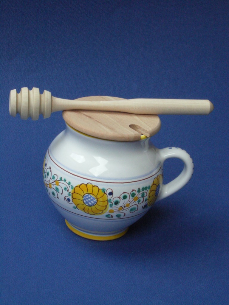 Ručne točený na elektrickom hrnčiarskom kruhu s jedným šlikrom nalepeným uchom, raz vypálený, poliaty bielou krycou glazúrou, do ktorej je maľovaný rastlinný farebný (jednofarebný) okontúrovaný dekor, druhý krát vypálený v elektrickej hrnčiarskej peci. Rôzne varianty dekorov. Hrnček má drevený vrchnák s drevenou meduľkou – naberačkou na med.
