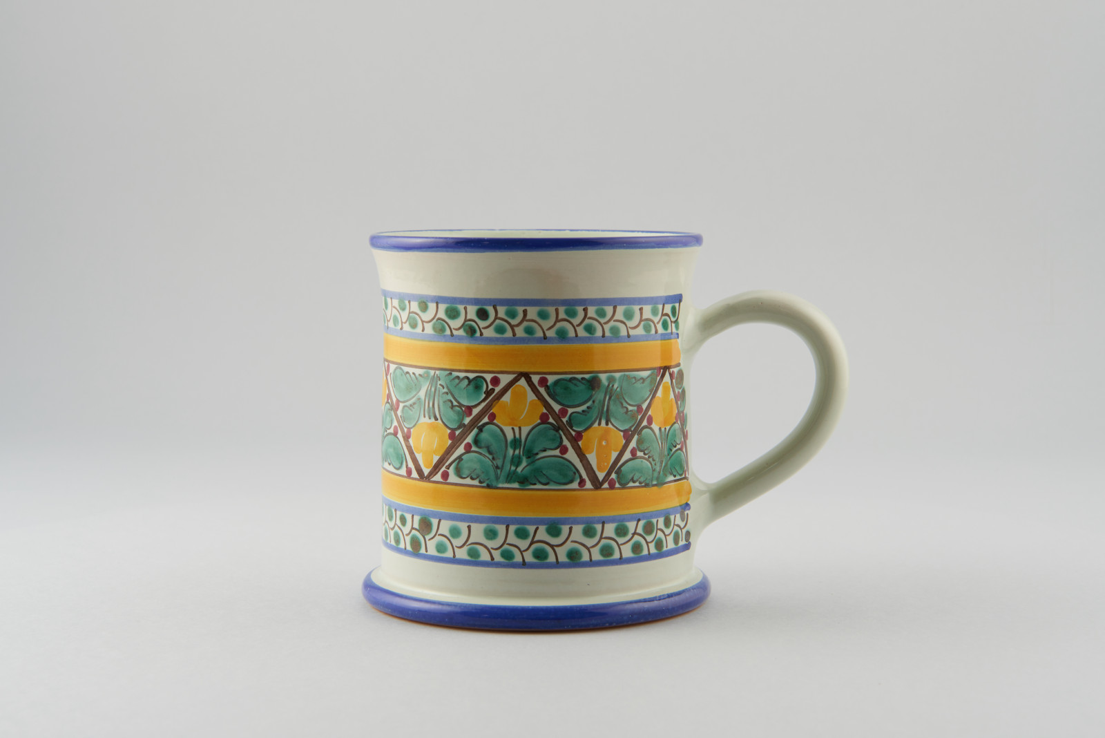 Kolekcia 8 ks hrnčekov, majolika, rovný tvar s uškom, širšie dno. Variácie štylizovaných dekorov inšpirovaných tradičnými motívmi západoslovenskej majoliky. Farebnosť: žltá, zelená, modrá, hnedá kontúra, biela a žltá podkladová glazúra.