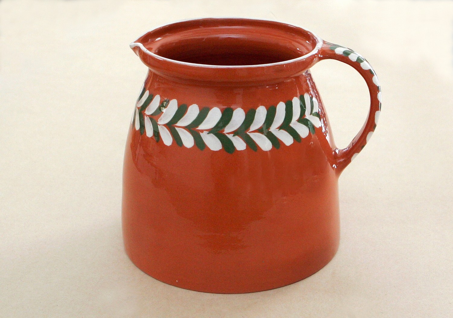 Ručne točený na hrnčiarskom kruhu, zdobený na surový črep lístkovým dekorom po obvode nádoby v strede, transparentná bezfarebná glazúra.