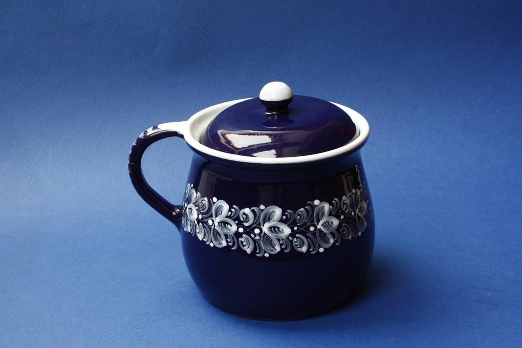 Ručne točený na hrnčiarskom kruhu, s dvoma ušami a pokrievkou, poliaty zvnútra bielou krycou, zvonka modrou glazúrou, maľovaný bielym rastlinným alebo geometrickým dekorom. Možný inofarebný variant.