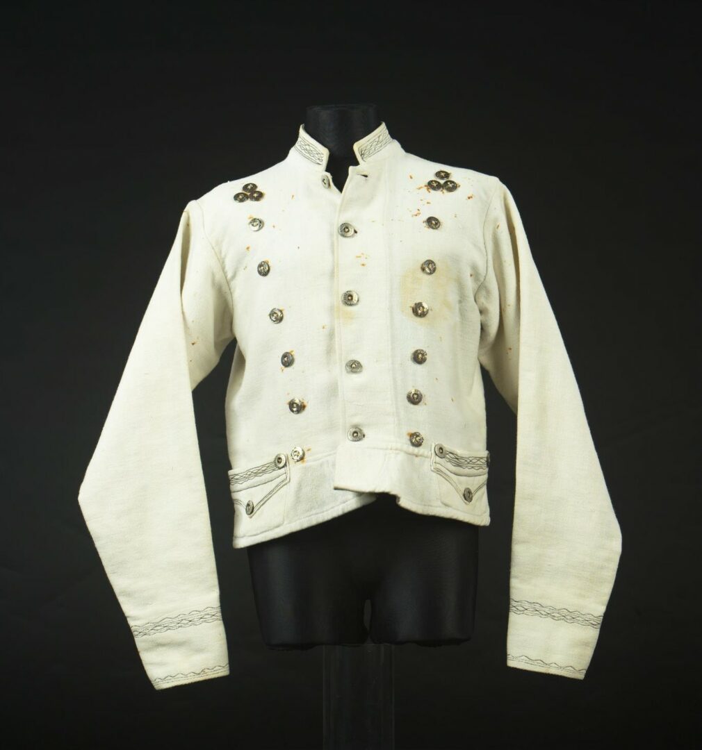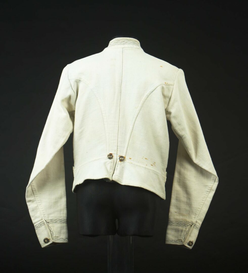Kabátik je ušitý z bavlneného drilichu, ktorý nazývali „magočkovi“. Na stojačiku, vreckách a koncoch rukávov je ozdobený štepovaním čiernou niťou. Zapína sa na kovové gombíky, tie sú na kabátiku našité aj ako ozdoba. Kabátik je ušitý na stroji.