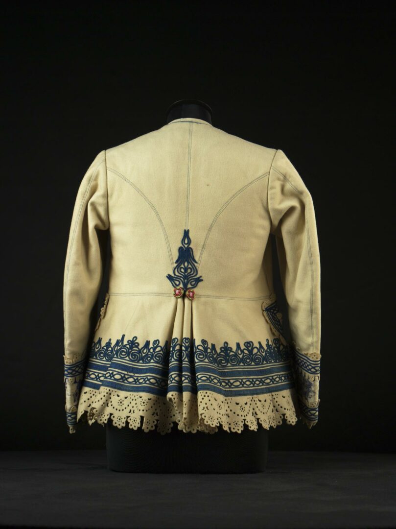 Kabátik z továrenského súkna má driekovú časť podšitú flanelom a časť od pása dole je podšitá keprovou látkou. Okraje lemuje „čipka“, pás súkna, v ktorom je raznicami vydierkovaný ozdobný vzor. Na manžetách rukávov je našitá polohodvábna žakárová látka. Bohaté šnurovanie je z harasového šujtáša. Kabátik je ušitý na stroji, väčšina šnurovania je prišívaná ručne. Na oboch predných dieloch sú našité kovové gombíky so sklenenými očkami. Kabátik sa zapínal k sebe našitými háčikmi a očkami.