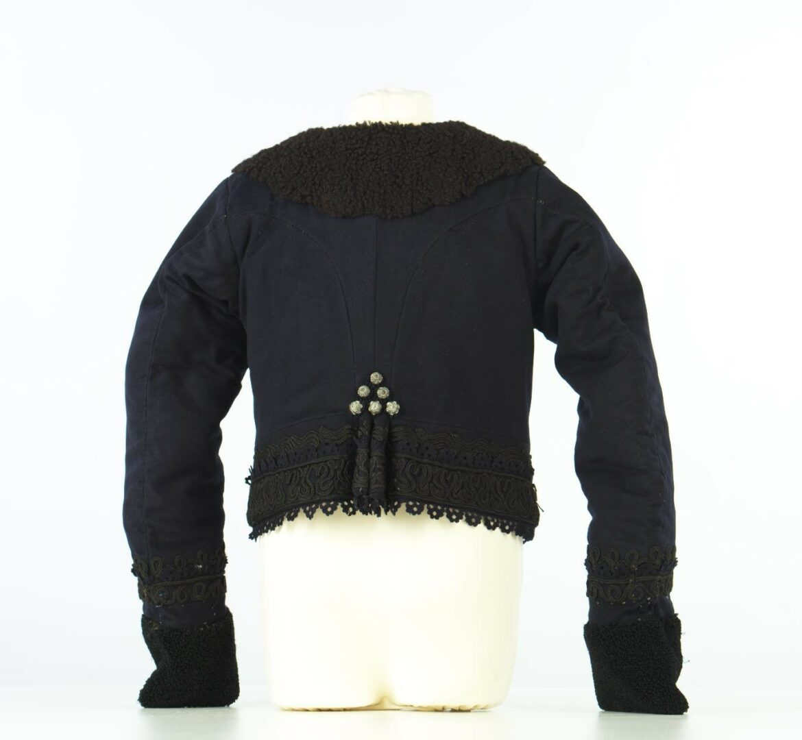 Kabátik z továrenského súkna je podšitý vlnenou látkou. Priekrčník a predné diely sú olemované ovčou kožušinou, konce rukávov lemuje umelá kožušina (uzlíčková tkanina). Dolný okraj kabátika lemujú ozdobné zúbky zo súkna, dopĺňajú aj šnurovanie z harasového šujtáša. Dolné rohy predných dielov sú vyhrnuté a podšité hodvábnym brokátom. Kabátik sa zapína na cínové spinky, z ktorých jedna časť chýba. Na predných dieloch, aj na chrbte, sú našité kovové gombíky striebornej farby.