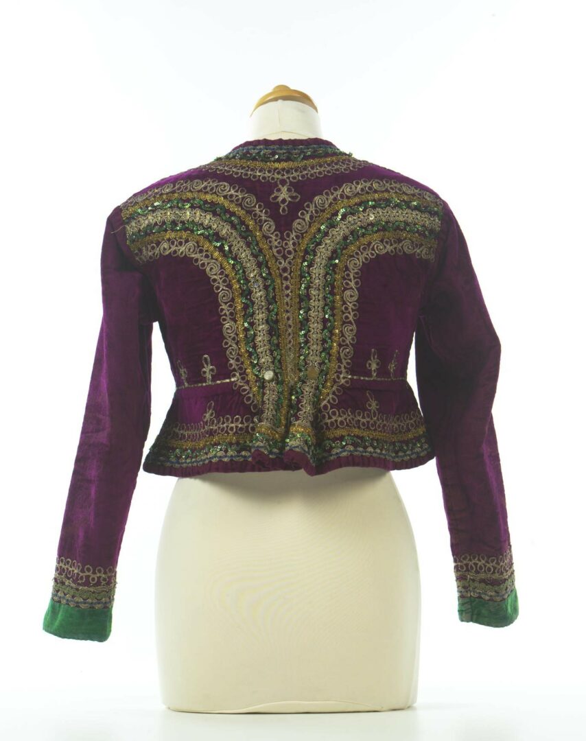 Kabátik z plyšu je podšitý flanelom. Na kabátiku je nášivka rôznych ozdôb z kovových nití, flitrov a korálkov. Okrem nášivky je na kabátiku bohaté šnurovanie zo šnúry z kovových nití striebornej farby. Výzdobu dopĺňajú našité gombíky. Kabátik sa zapína na kovové háčiky a očká.
