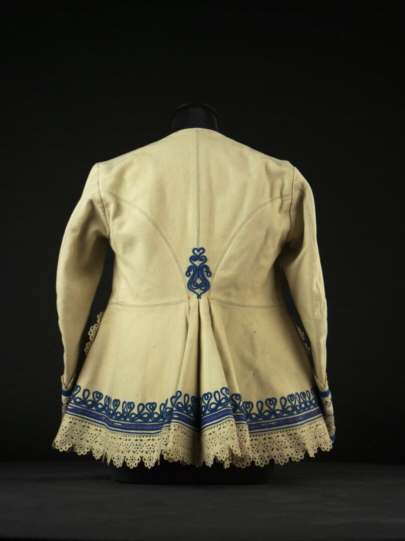 Kabátik z továrenského súkna je podšitý keprovou látkou. Okraje lemuje „čipka“ , pás súkna, v ktorom je raznicami vydierkovaný ozdobný vzor. Na manžetách rukávov je našitá polohodvábna žakárová látka. Bohaté šnurovanie je z harasového šujtáša. Kabátik je ušitý na stroji, väčšina šnurovania je prišívaná ručne. Šnurovanie dopĺňa strojom našitá hodvábna stužka. Na oboch predných dieloch sú našité kovové gombíky so sklenenými očkami. Kabátik sa zapína kovovými háčikmi a očkami.