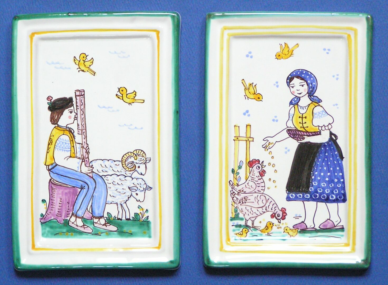 Vtláčané do formy, raz vapálené, poliate bielou krycou glazúrou, do ktorej je majolikovými farbymi maľovaný farebný okontúrovaný dekor, druhý krát pálené v elektrickej keramickej peci. Rôzne figurálne a rastlinné motívy.