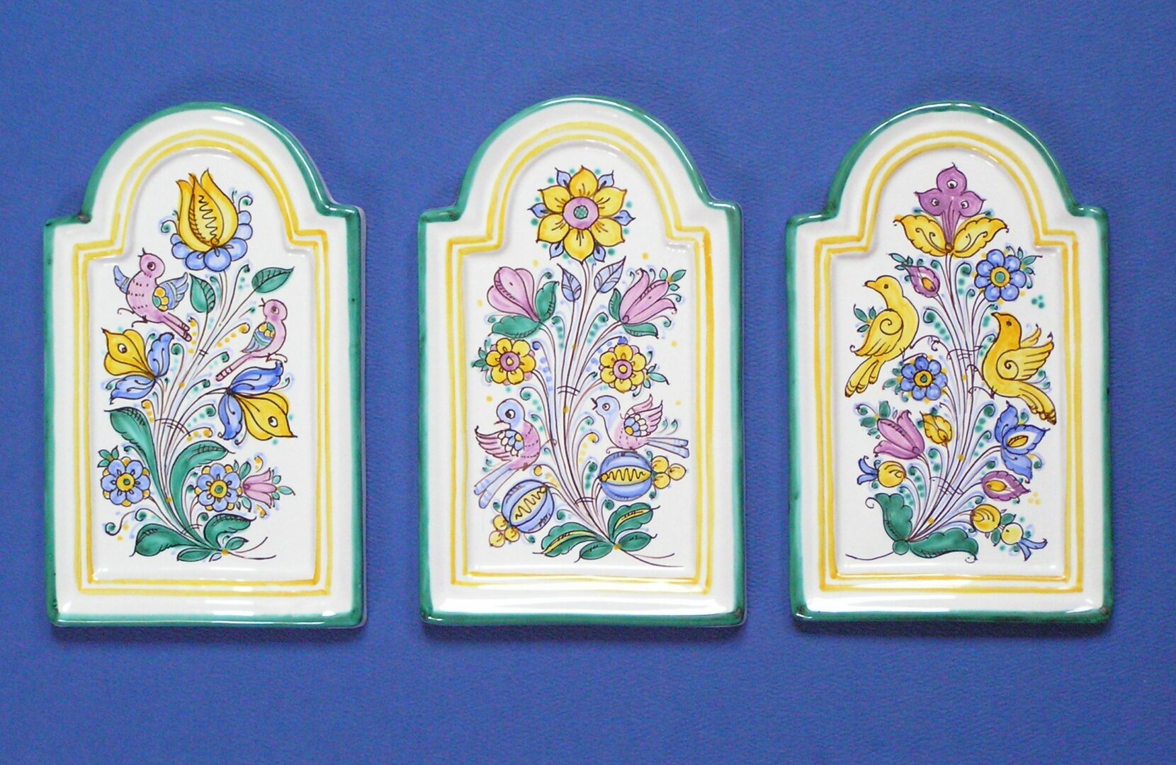 Vtláčané do formy, raz vypálené, poliate bielou krycou glazúrou, do ktorej je maľovaný majolikovými farbami farebný (jednofarebný) okontúrovaný rastlinný, alebo architektonický dekor, druhý krát vypálené v elektrickej keramickej peci. Rôzne motívy a farebné variácie.