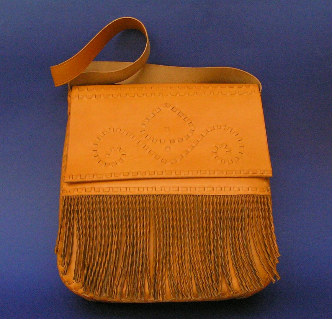 Kapsa na rameno s príklopom a strapcami z mazanej kraviny, ručne šitá a zdobená preťahovaným remienkom.
