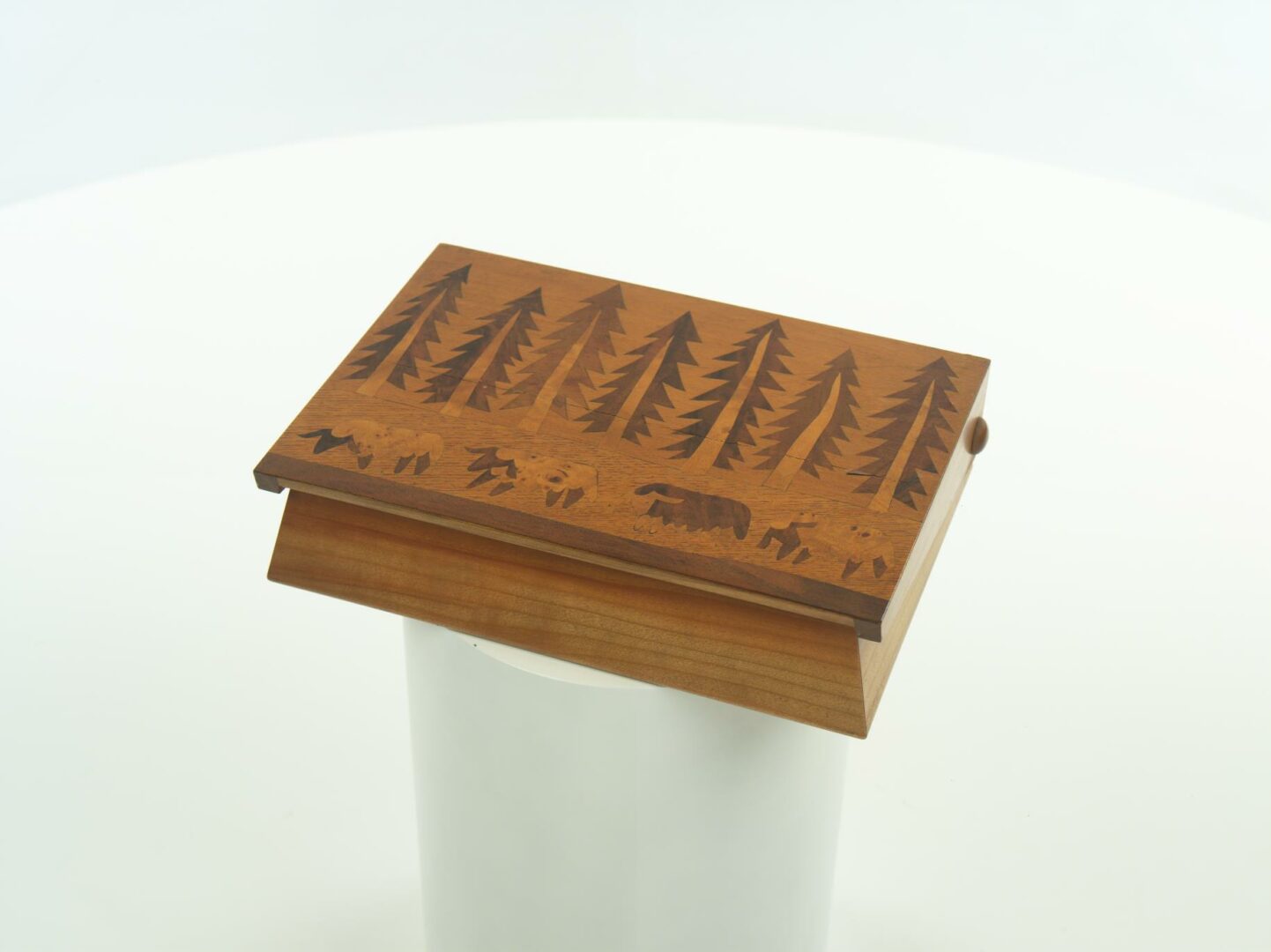 Kazeta drevená na karty (fajčiarske potreby), s odklápacím vekom a dvomi prihrádkami. Steny kazety sú kónické. Veko na pohľadovej časti zdobené intarziou – pasúce sa ovce, v pozadí ihličnatý les.