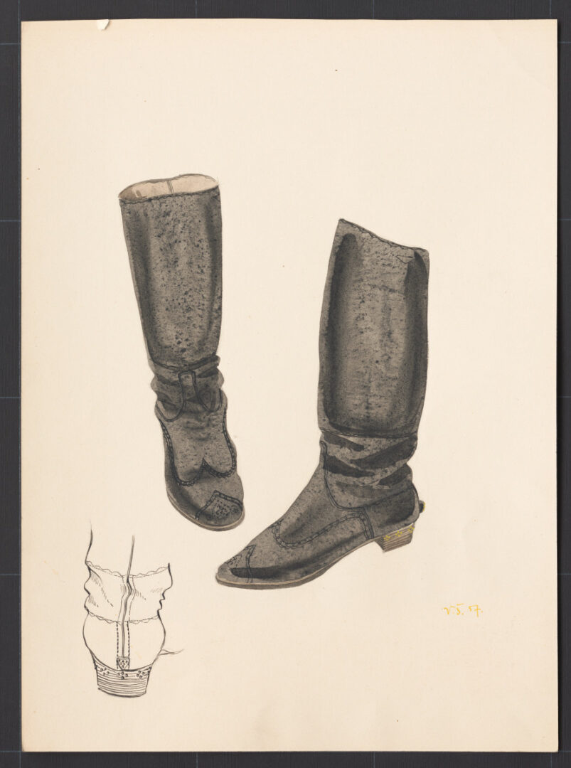 Ženské čižmy, Ábelová, začiatok 20. storočia. Čižmy majú tvrdú sáru, s jedným švíkom vzadu. Ušité sú z jemnej čiernej kože. Priehlavky sú z dvojitej kože, vrchná koža je ozdobne perforovaná. Opätky sú polovysoké, vybíjané drobnými mosadznými cvočkami. Malý kožený výstupok nad opätkom slúžil ako pomôcka pri vyzúvaní. V druhej polovici 19. storočia boli čižmy drahou a vzácnou obuvou. Nosili sa iba do kostola. Prestali sa nosiť pred druhou svetovou vojnou.
