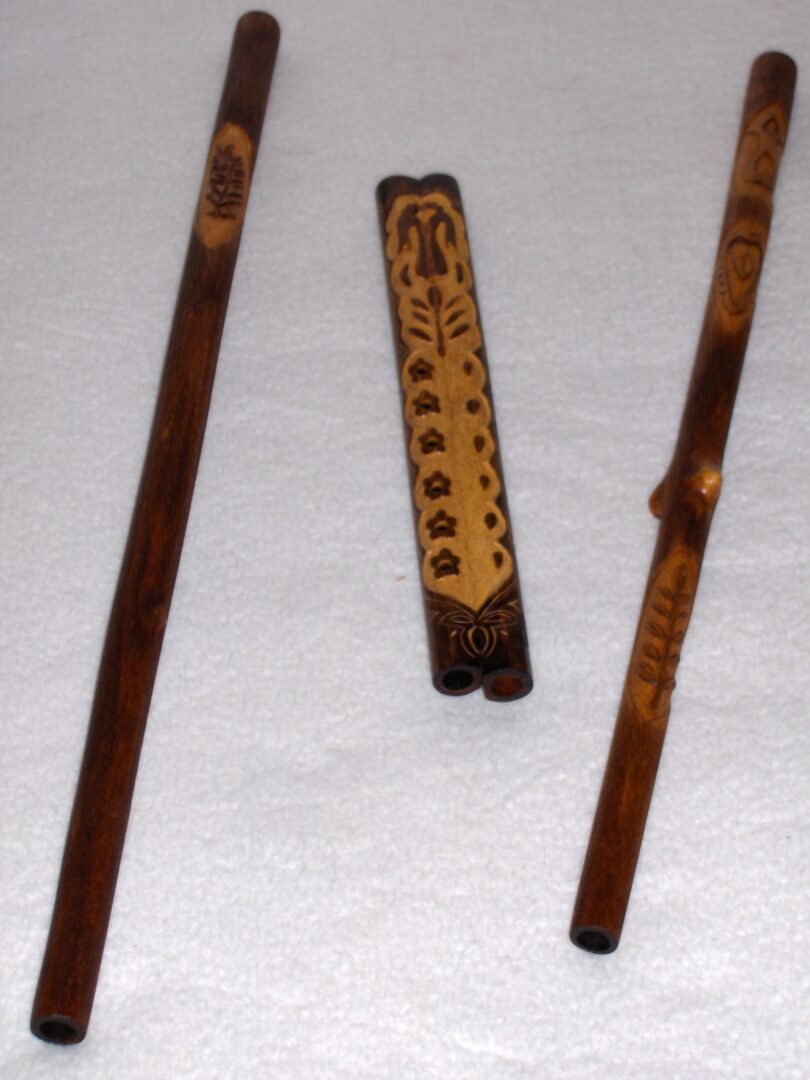 Koncovka je zdobená vyrezávaním a vzory sú morené. Povrch je ošetrený šelakom.