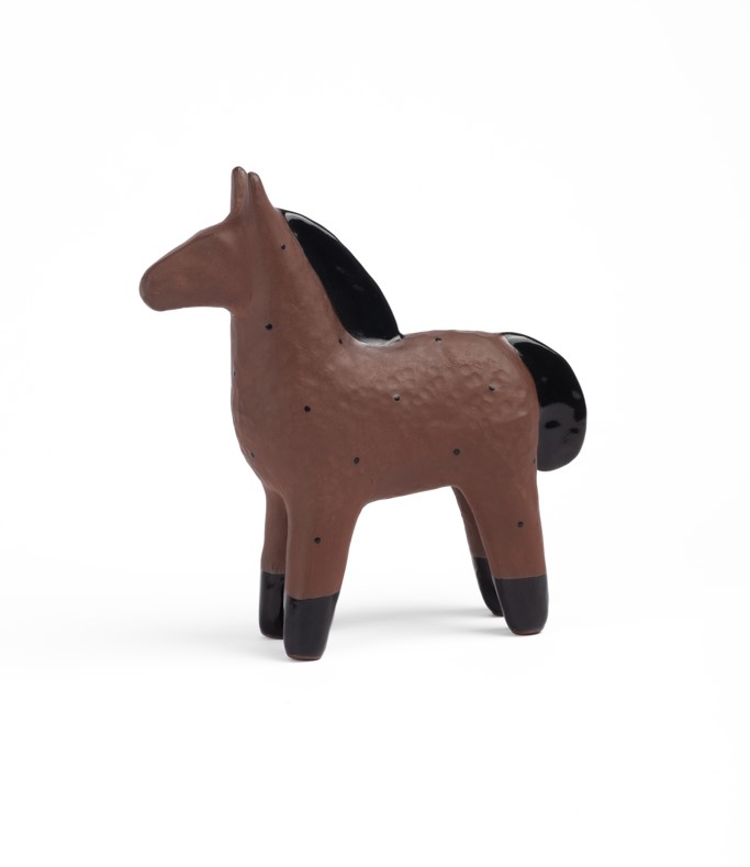 Odlievaný koník z kameniny, ručne domodelovaný a maľovaný.