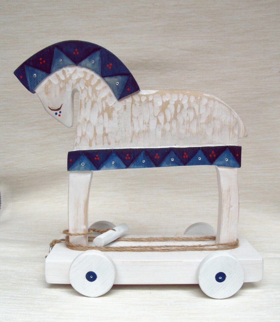 Koník na podvozku s kolieskami je ručne vyrezávaný a zdobený vruborezom maľovaním. Je bez povrchovej úpravy.