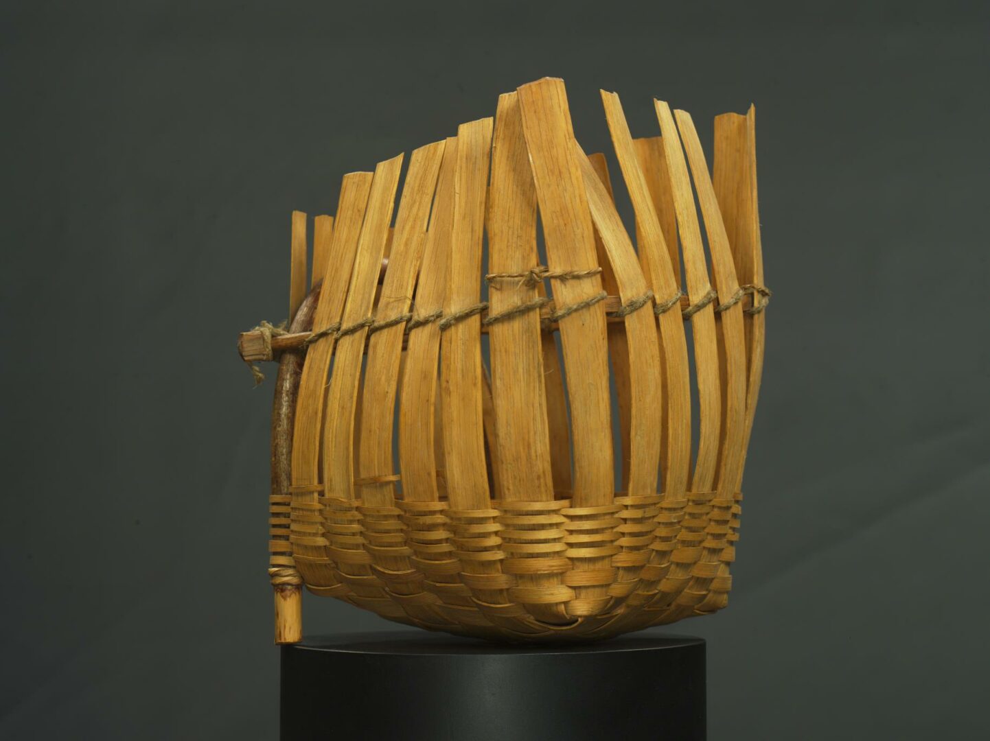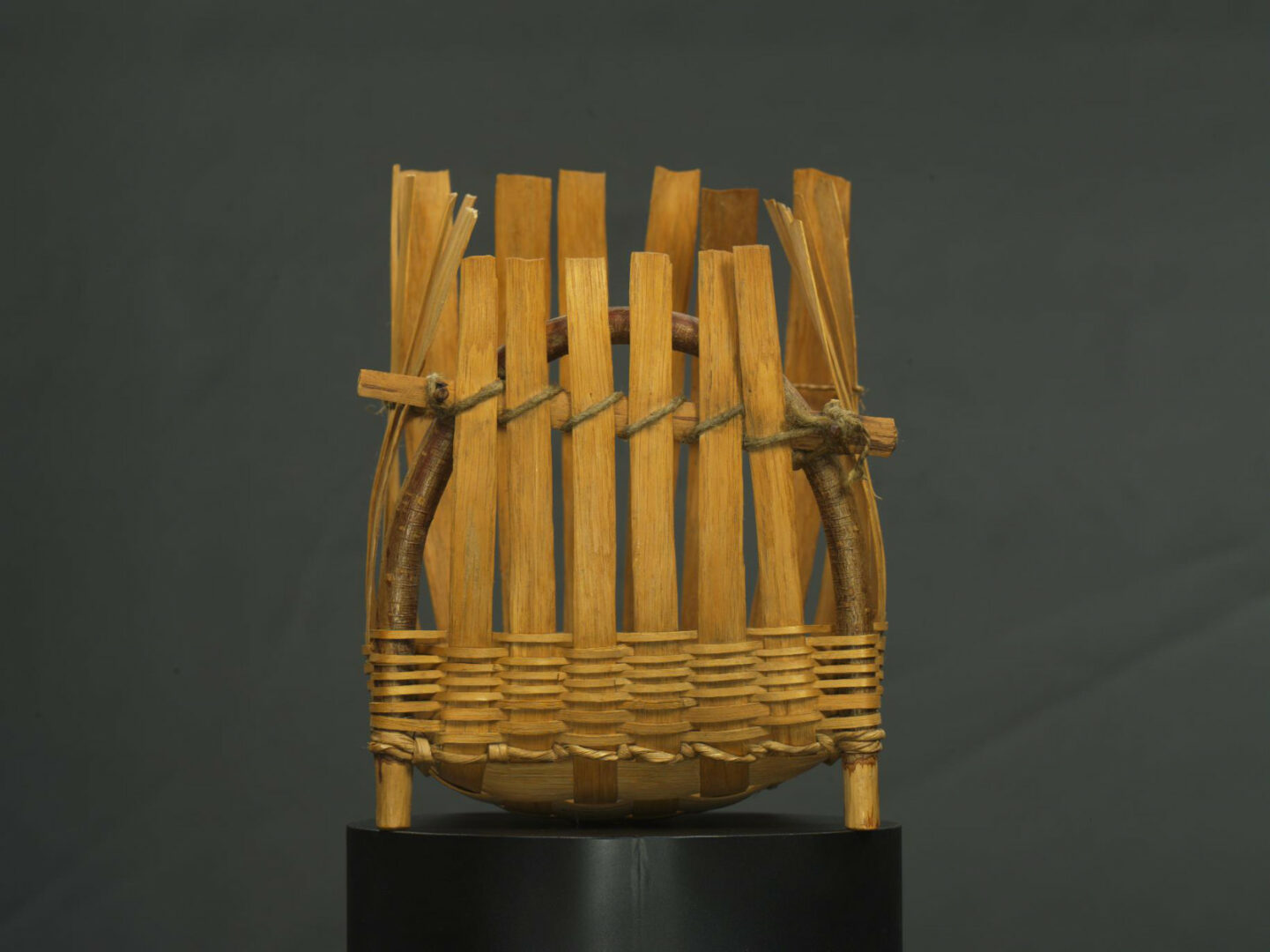 Koš rozpracovaný, pletený z lubov. Chrbtový kôš čiastočne vypletený so zadnou stranou z ohnutého dreva –guľatiny, spodná časť čiastočne vypletená z lubov, horná časť s kostrou zviazanou povrazom. Na zadnej strane je rúčka. Technika pletenia je plátnová väzba.