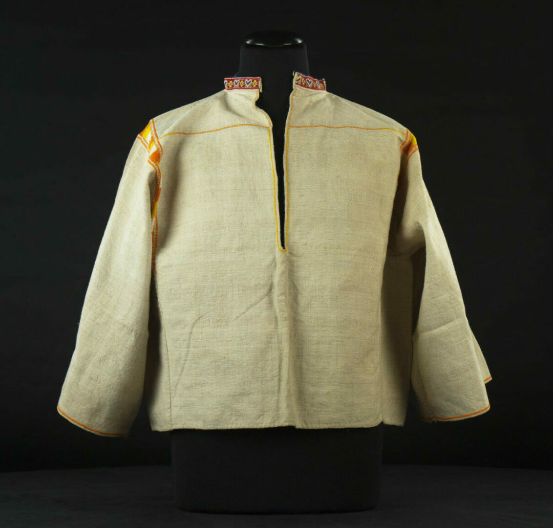 Košeľa z domáceho plátna má časť na pleciach a chrbte podšitú továrenským plátnom. Zpredu je podšitie prišité mešterkou. Rozparok a konce rukávov sú zapracované tiež mešterkou. Rukávy sú s driekovou časťou zošité spojovacím švíkom. Do priekrčníka je všitý golierik, vyšitý je farebne krížikmi. Horný okraj golierika lemujú ušité zúbky.