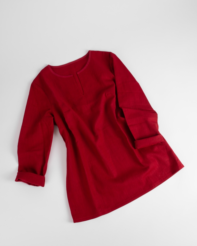 Zaujímavosťou je, že šije aj s tkanín potlačených perrotínovým strojom podľa jej návrhu, pričom vzor potlače je inšpirovaný modrotlačovovými raznicami. Technika výroby látky imituje modrotlač, je založená na potlači reaktívnym farbivom tepelnou fixáciou pri 160°C, čím sa dosiahne odolnosť látky proti oderu a stabilizácia farby. Látka tak pri praní nepúšťa.
