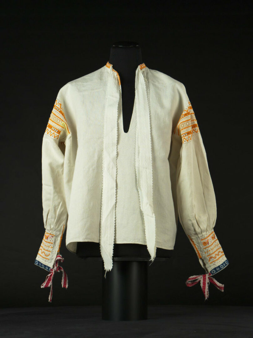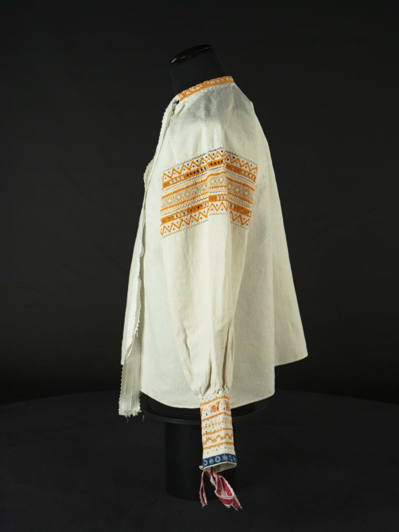Košeľa je z domáceho plátna. Rukávy sú k driekovej časti prišité pomocou paličkovanej čipky. Z oboch strán čipky sú vyšité pásy hrachovinky, hladkovania a dierky. Konce rukávov sú naskladané, cez sklady je urobená výšivka, šitá krajčírskou retiazkou. Rukávy sú všité do obalka, ktorého lícovú časť tvorí našitá tkanica. Golierik košele je vyšitý rastlinným ornamentom, retiazkou a v prehybe sú ušité zúbky. Ku golieriku a pod ním sú našité dva páry viazačiek.
