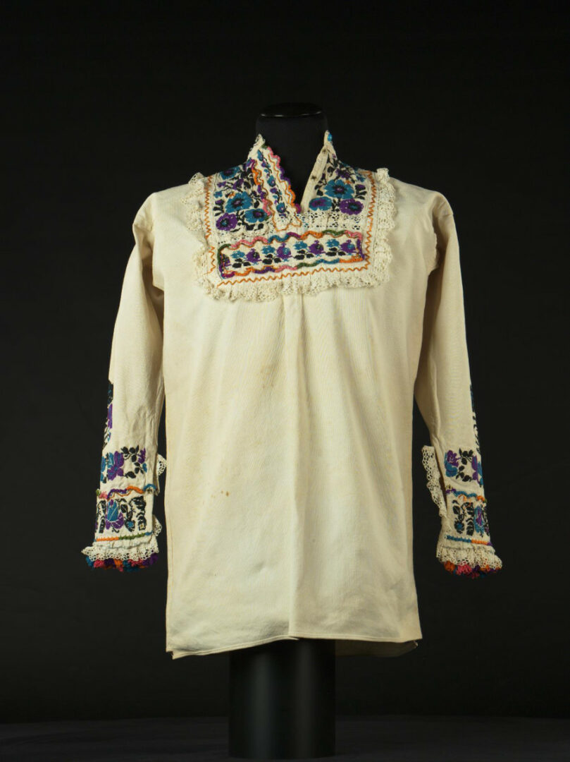 Košeľa je ušitá z domáceho bavlneného plátna. Časť košele zakrývajúca plecia je podšitá továrenským plátnom. Výšivka na košeli je šitá krížikmi. Na prednej časti je doplnená našitou bielou strojovou výšivkou, ktorá lemuje aj konce rukávov. Časti výšivky našitej na košeli sú olemované háčkovanými zúbkami. Háčkovaná čipka je našitá aj na konci rukávov, pod strojovou bielou výšivkou. Výzdobu na košeli dopĺňajú našité sklenené sekané korálky.