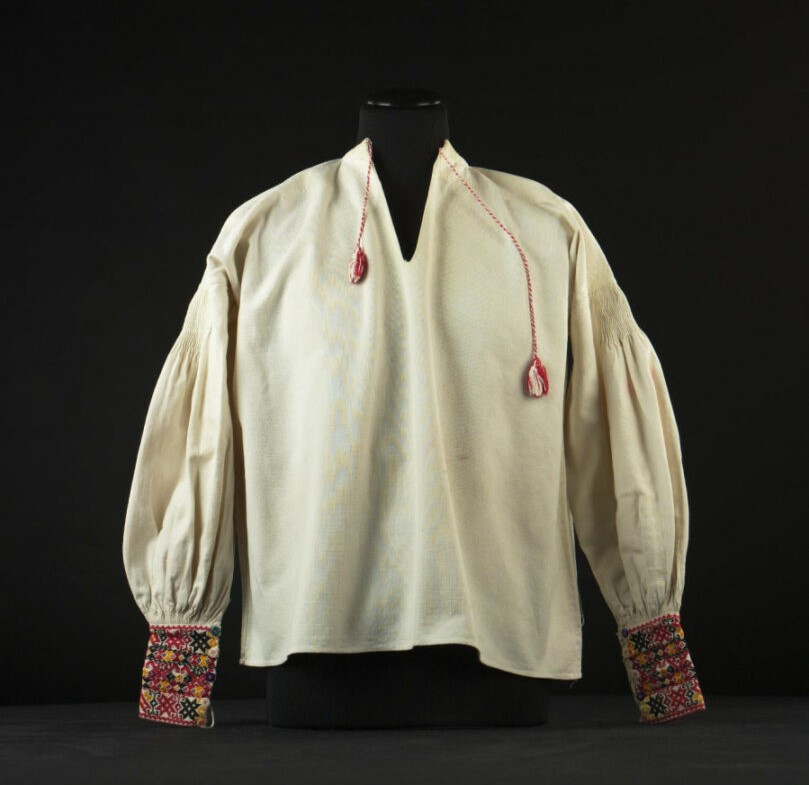 Košeľa je ušitá z domáceho bavlneného plátna. Časť zakrývajúca plecia je podšitá tým istým plátnom a ozdobne preštepovaná strojom. Rukávy sú na koncoch nariasené a všité do širokej manžety, ktorá je vyšitá krížikovou výšivkou. Manžety sa zapínajú na gombíky a slučky zhotovené zo šnúrky. Ku krčnému výstrihu sú prišité pletené šnúrky ukončené strapcami.