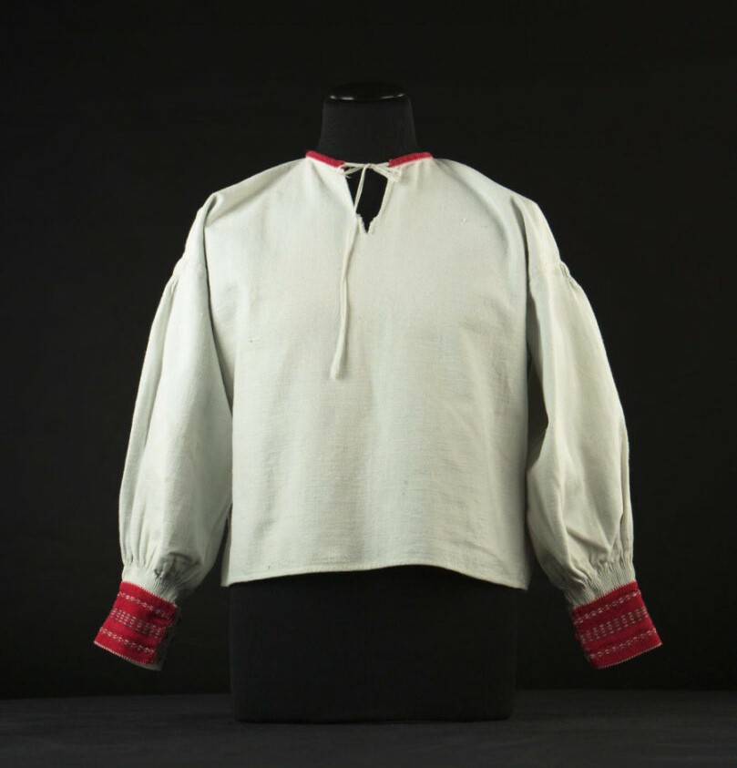 Košeľa je ušitá z keprovej tkaniny, ktorá má osnovu z bavlny a útok z ľanu. Manžety a golierik sú zo vzorovanej ripsovej tkaniny.