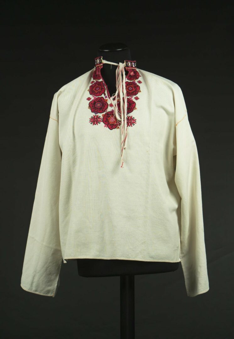 Ušitá je z domáceho pamokového plátna. Golierik má vyšitý krížikmi a otvorenou retiazkou. Okolo obslučkovaného rázporka je predkreslená výšivka, veľké motívy kvetov vyšité plným plochým stehom konturované retiazkou. Doplnené sú hladkovanými geometrickými motívmi.Predkreslený rastlinný motív je vyšitý aj v dolnej časti chrbta.