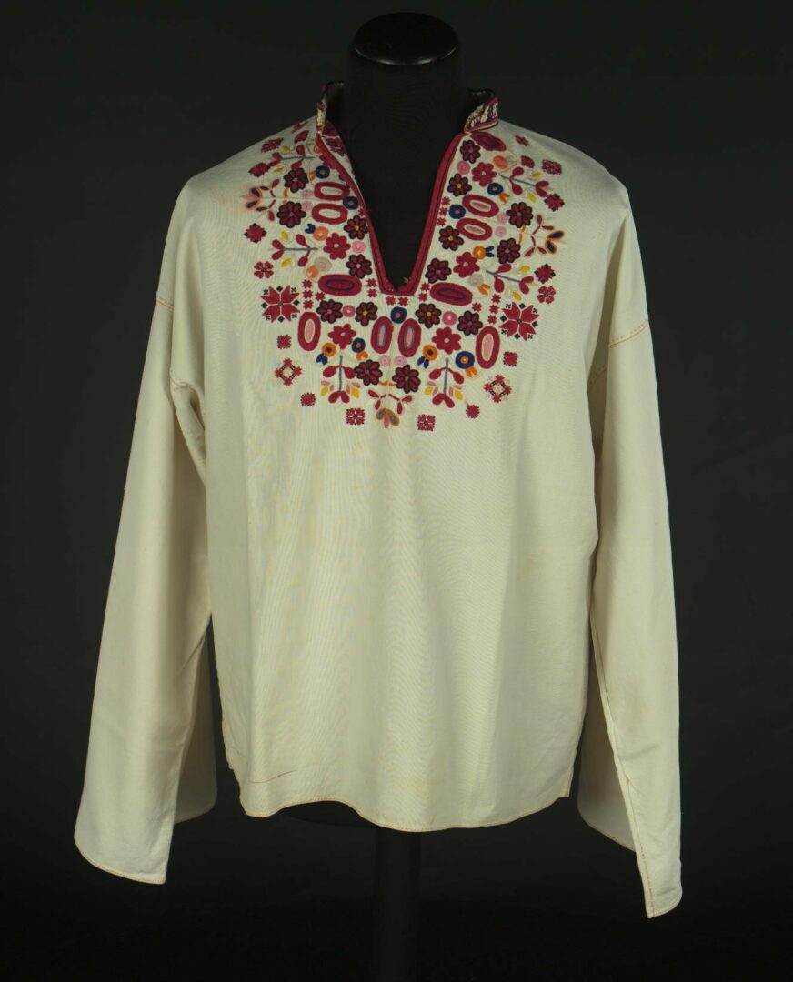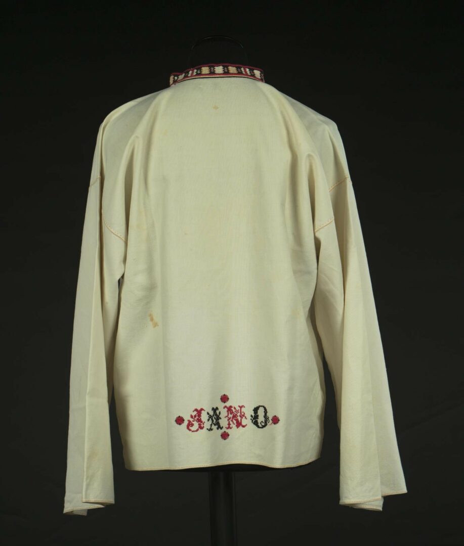 Ušitá je z domáceho pamokového plátna. Golierik má vyšitý krížikmi a otvorenou retiazkou. Okolo obslučkovaného rázporka je umiestnená predkreslená výšivka, rastinné motívy sú doplnené geometrickými motívmi rôznej veľkosti. Predkreslená výšivka je urobená slučkovacím stehom a retiazkou. Na dolnom okraji zadnej časti je krížikmi vyšité meno JANO.