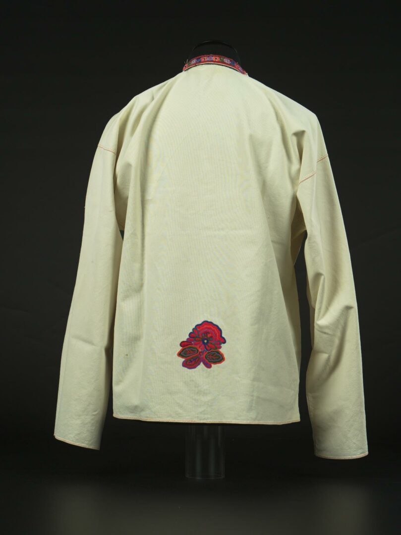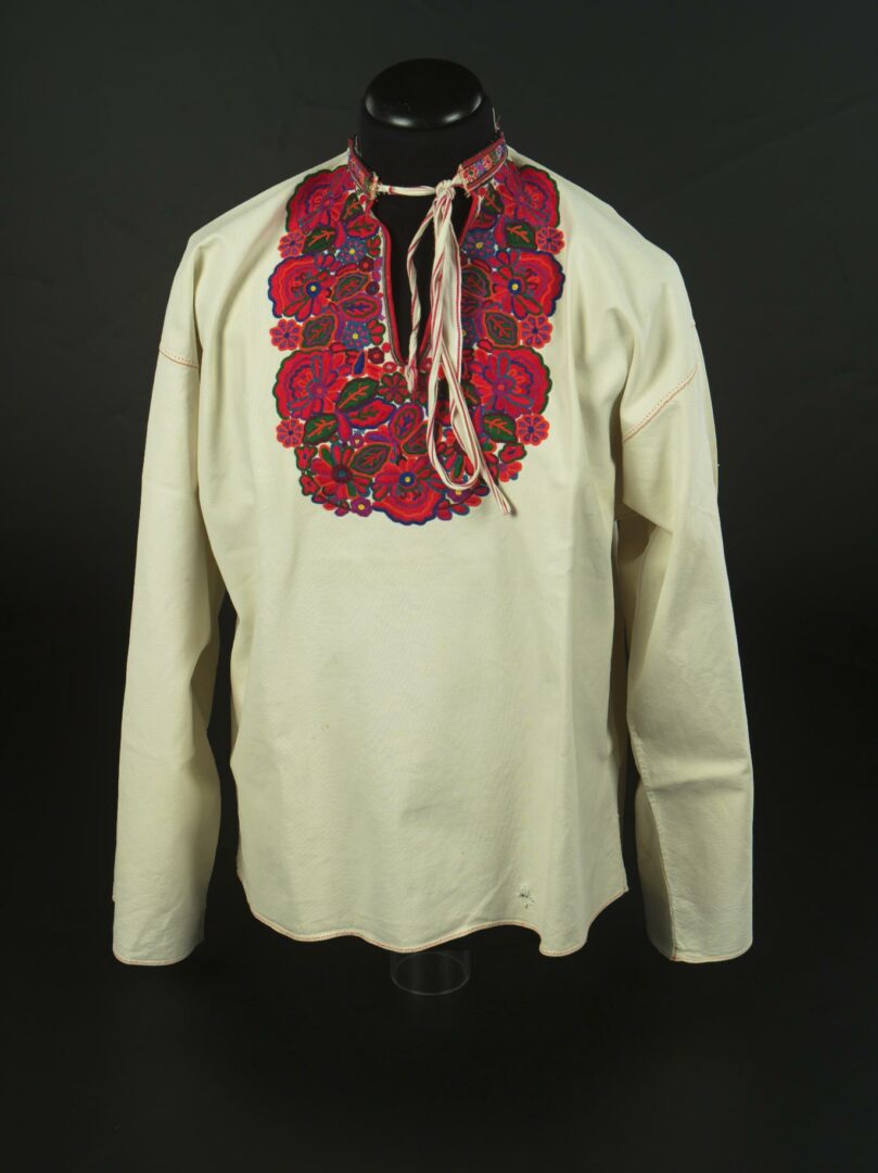 Ušitá je z domáceho pamokového plátna, golierik je vyšitý podľa počítania nití, časť okolo rázporka a na dolnej časti chrbta je vyšitá predkreslenou výšivkou. Na golieriku je použité hladkovanie a otvorená retiazka, rázporok je obslučkovaný. Predkreslená výšivka je robená plným plochým stehom a retiazkou.