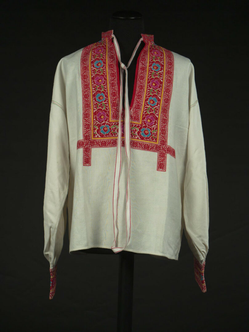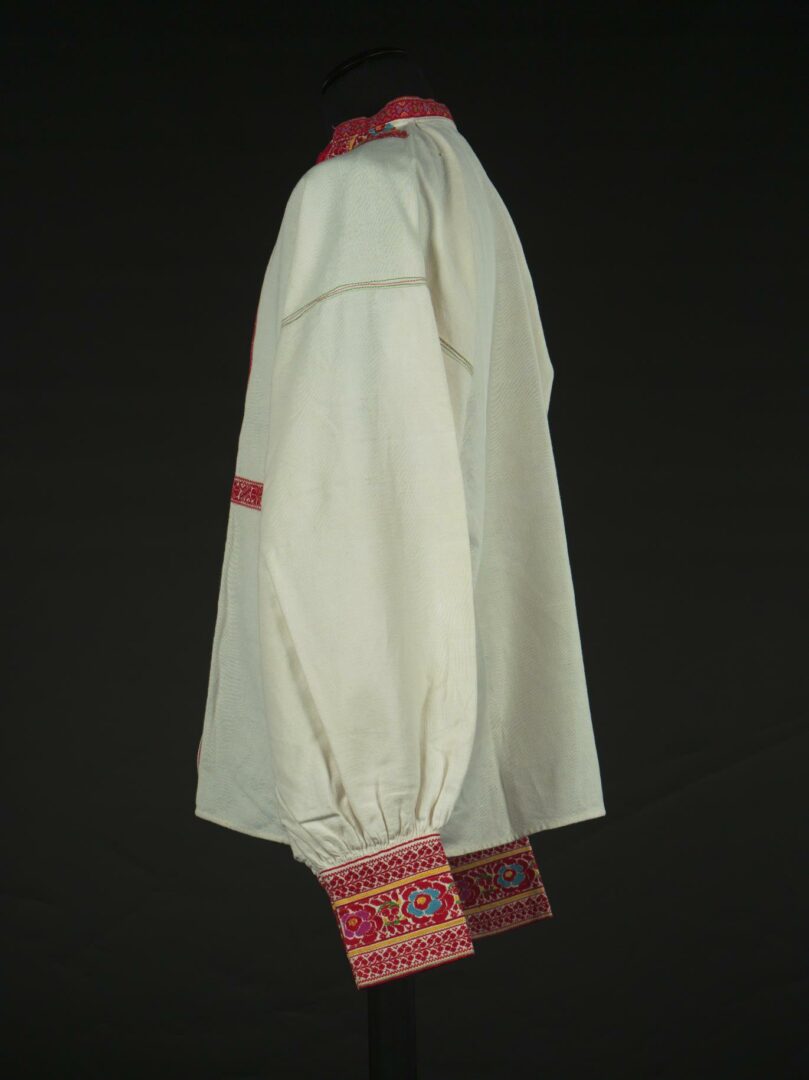 Ušitá je z domáceho plátna. Ozdobená je výšivkou podľa počítania nití na golieriku, manžetách a okolo rázporka na prednej časti. Vzor výšivky je zložený z rastlinných motívov. Použité stehy: krížik, hladkovanie, mešterka, zadný steh, slučkovací steh. Košeľa je šitá strojom.
