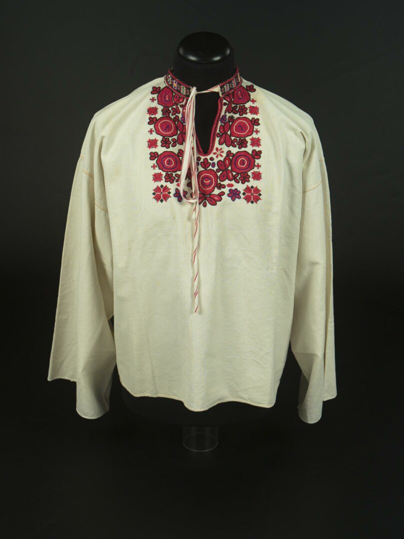 Ušitá je z domáceho pamokového plátna. Na golieriku je výšivka podľa počítania nití. Použité stehy: krížik, otvorená retiazka, slučkovací steh. Okolo rázporka je predkreslená výšivka, kvetinové motívy sú vyšité plným stehom a konturované retiazkou. Ku golieriku je prišitá keprovka na uväzovanie.