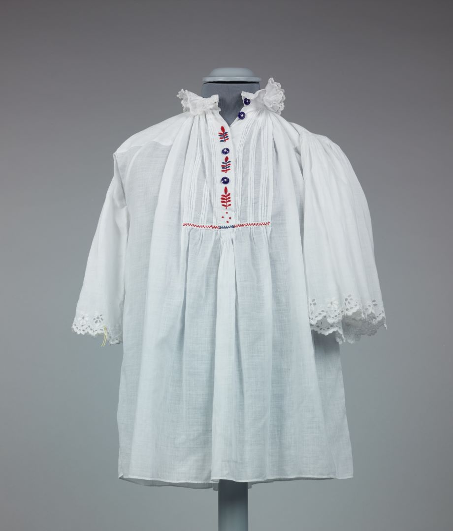 Ušitá je ručne z batistu. Predný diel má zapínanie na modré gombíky. Okolo zapínania sú ušité zámiky. Široké rukávy a golierik sú ukončené bielou dierkovou výšivkou. Na ušitej lége zapínania sú vyšité vetvičky plným plochým stehom.