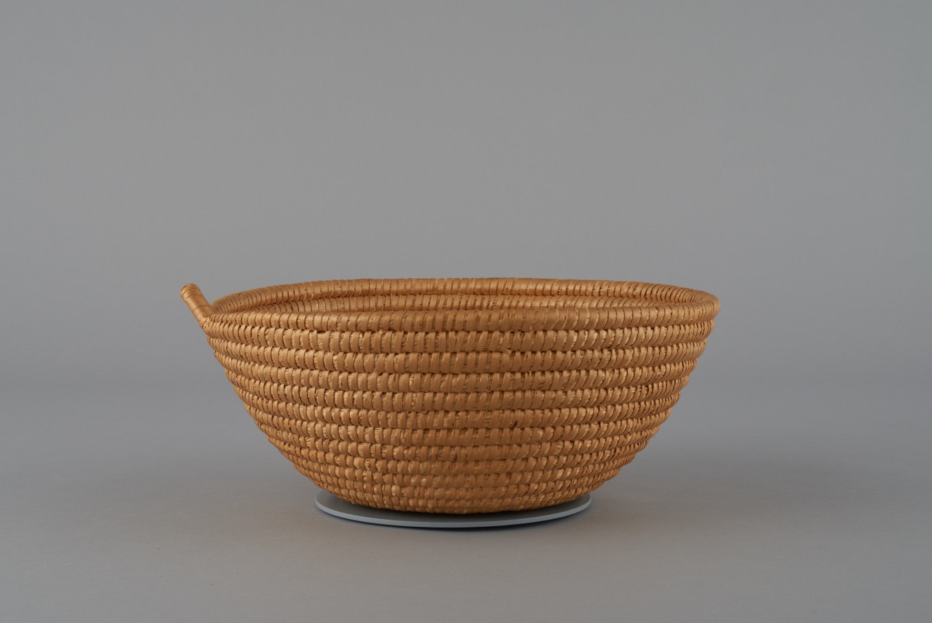 Košík zo slamy okrúhleho tvaru s jedným malým uškom na boku. Slama je špirálovo ukladaná a zošívaná štiepaným prútim.
