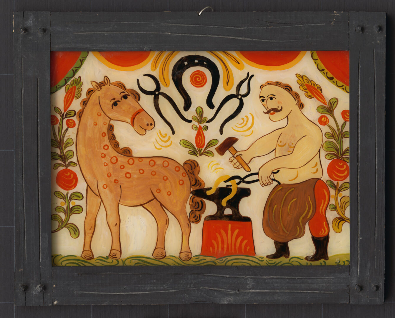 Maľba na skle: „Kováč“ – ústredným motívom je postava kováča kovajúceho podkovu, ktorú drží v klieštiach. Pri jeho nákove stojí kôň. Nad nákovou visia kováčske symboly – podkova medzi dvoma kliešťami. Po bokoch výjavu sú kvetinové motívy. Jednoduchý drevený rám v rohoch spojený drevenými klinmi.