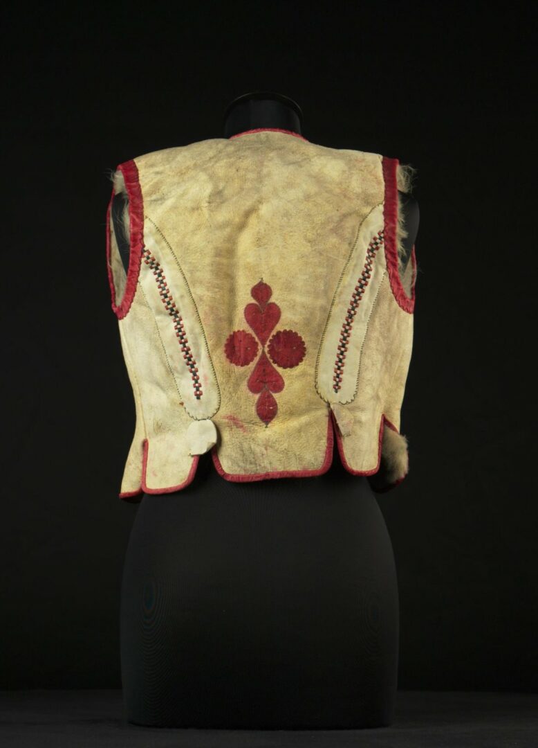 Kožuštek je z nefarbenej ovčej kožušiny. Lemy a gombíky sú z červenej irchy. Na kožušteku sú naaplikované ozdoby z irchy. Slučky, ktorými sa zapína o gombíky sú tiež z kože.