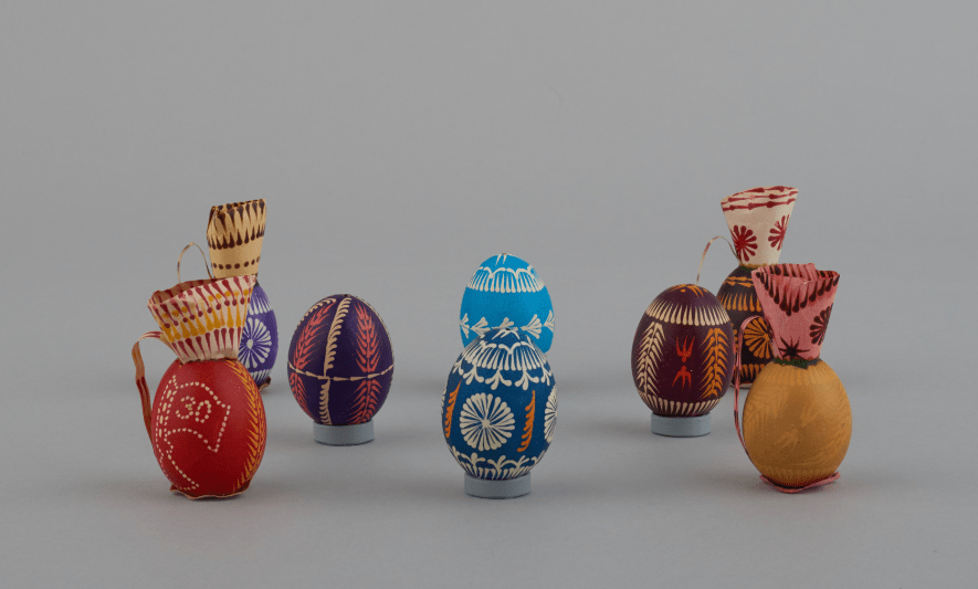 1. Kraslica batikovaná špendlíkom, podkladová farba hnedá, ornament žltý geometrický, pásový motív sĺnk a čiarok. Kraslica je doplnená papierom pomaľovaným červeným voskom, nalepený papier dáva kraslici tvar džbánu.