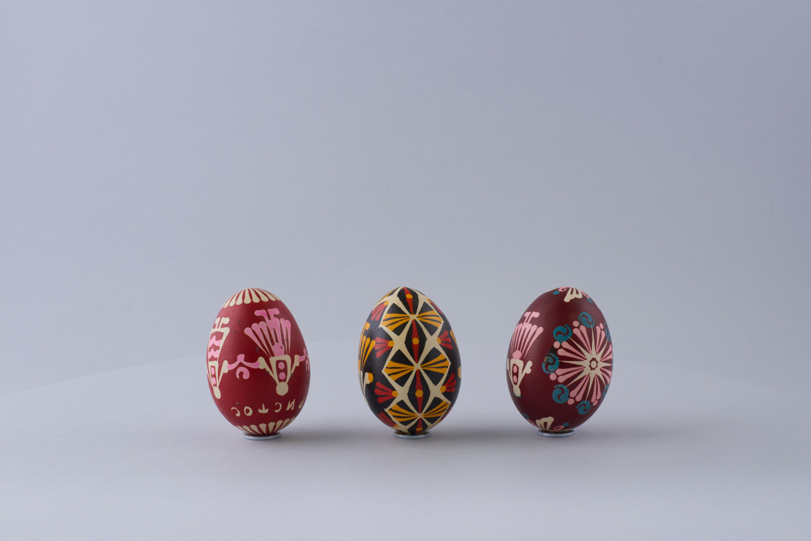 1. Vajíčko batikované špendlíkom, podkladová farba červená, ornament biely a ružový, figurálny motív tanečníc s textom „Christos vostres“.
