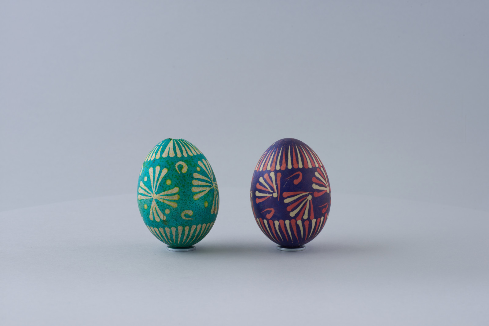 1. Kraslica batikovaná špendlíkom, podkladová farba zelená, ornament biely čiarkový. Vrcholový motív slnka, centrálny motív lúčov s bodkami. 2. Kraslica batikovaná špendlíkom, podkladová farba fialová, ornament čiarkový, biely a ružový. Vrcholový motív slnka a pásový motív lúčov. Kraslice sú slepačie, vyfúknutý obsah.