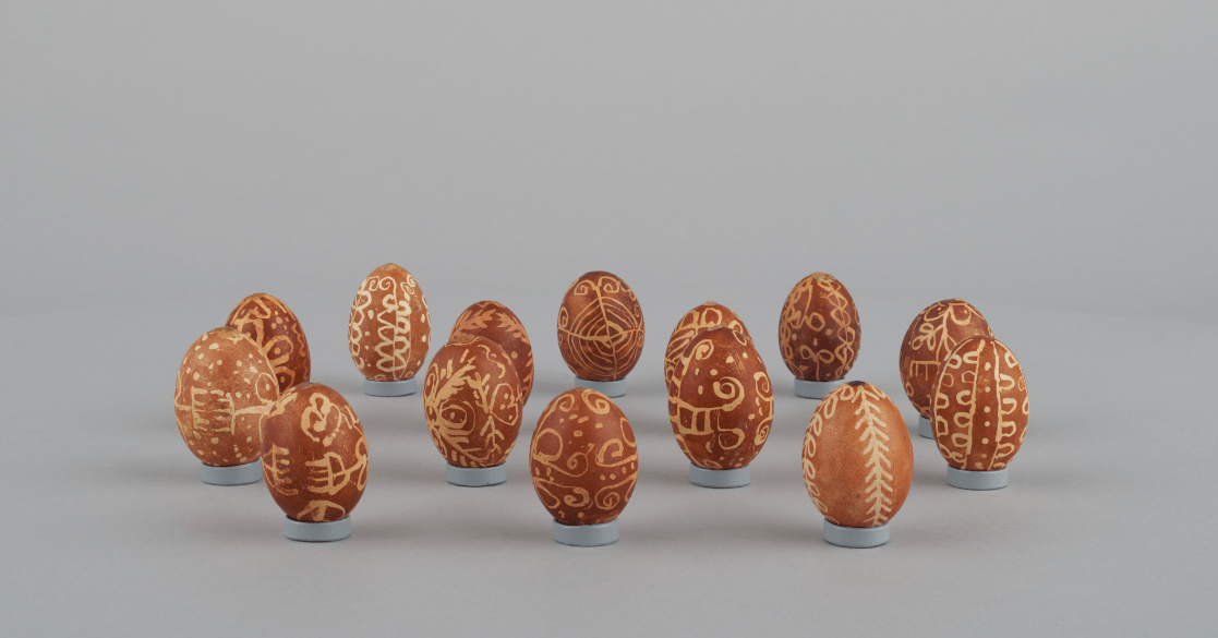 13. Kraslica batikovaná trubičkou zafarbená v odvare z cibuľových šupiek, zvislými pásmi s pooblúkmi rozdelená na 4 časti, z vrcholovou vyrastanú úponky. Kraslice sú slepačie, vyfúknutý obsah, hrubá kresba.