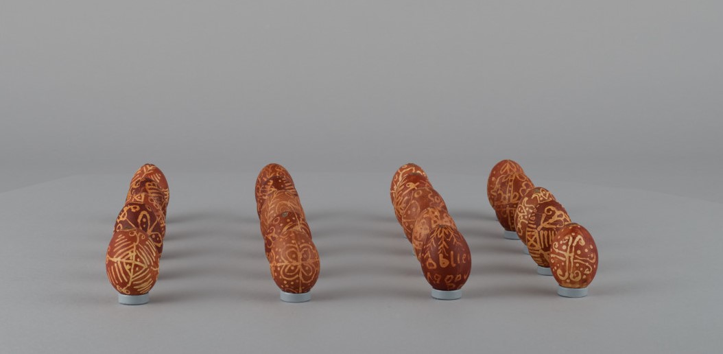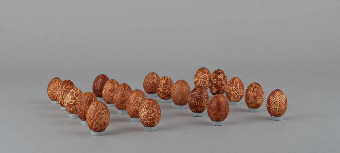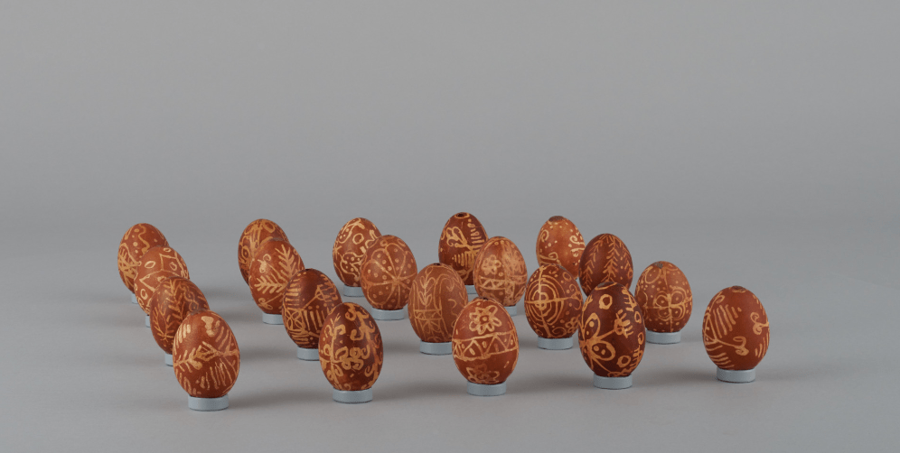 Kraslice batikované trubičkou, zafarbené v odvare z cibuľových šupiek. Žlté ornamenty na hnedom podklade, hrubá kresba. Slepačie výduvky (vyfúknuté vajíčka).