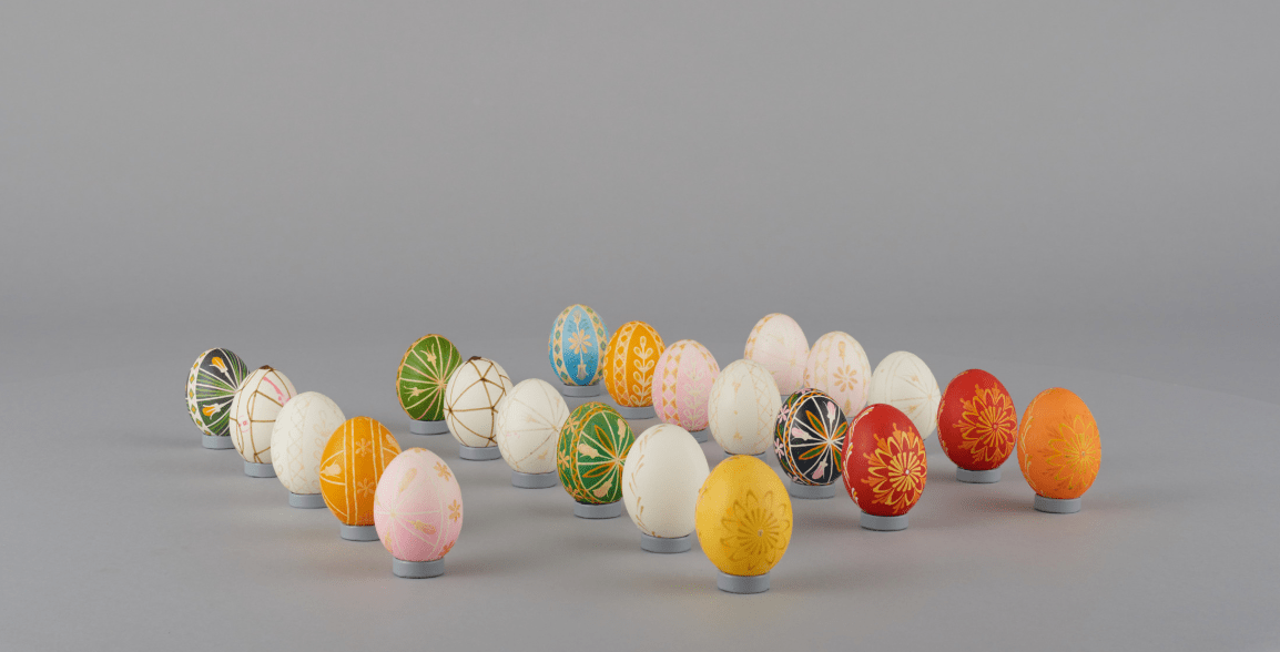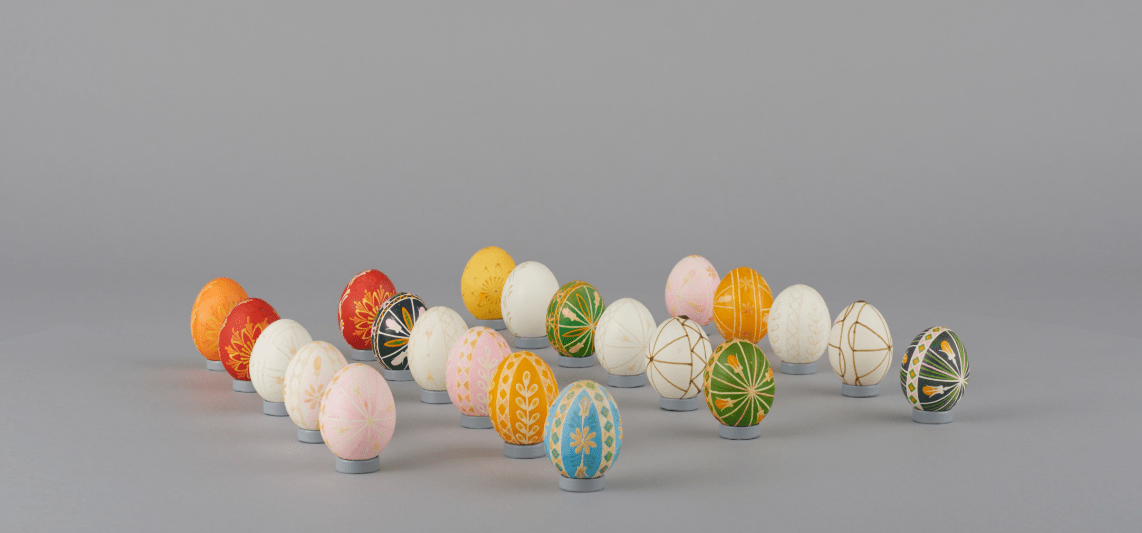 Postup výroby batikovaných kraslíc – kraslice znázorňujú postup výroby a postup farbenia. Kraslice majú rôzne vzory, použité sú techniky zdobenia špendlíkom a trubičkou.