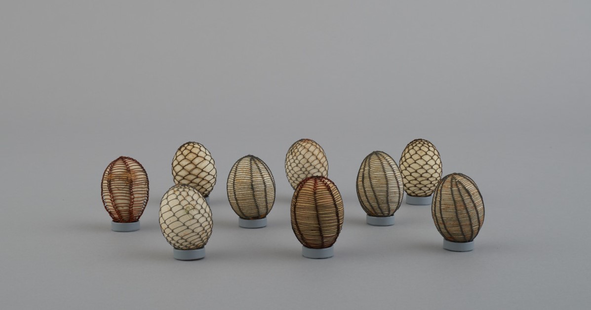 Vajíčka odrôtované tenkým medeným drôtom. Na piatich kusoch sa strieda široké a úzke očko. Úzke očko tvorí zvislú líniu. Na štyroch kusoch sú očka pletené rovnako veľké a vytvárajú sieť. Všetky sú slepačie, plné.