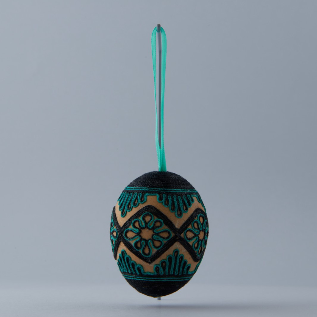 Vajíčko oblepené čiernými a zelenými bavlnkami, vzor predstavujú kosoštvorce v páse s motívom kvetu v strede. V hornej časti je svetlo zelená stužka na zavesenie. Vajičko je slepačie, vyfúknuté.