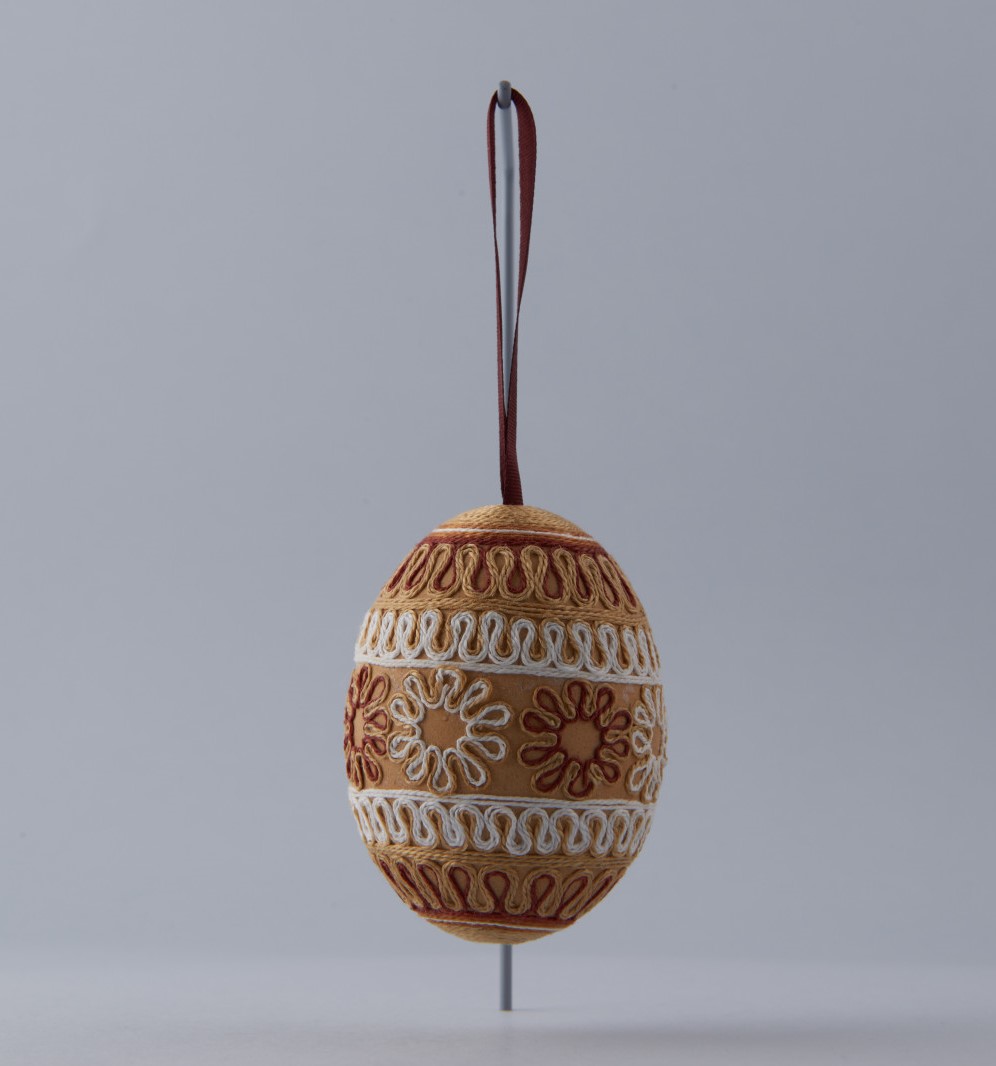 Vajíčko oblepené bielymi, béžovými a hnedými bavlnkami, motívy sú v pásoch – kvety a vlnovky. V hornej časti hnedá stužka na zavesenie. Vajičko je slepačie, vyfúknuté.
