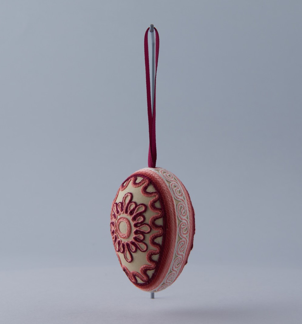 Vajíčko oblepené bielou, ružovou a bordovou bavnkou, centrálny rastlinný motív. V hornej časti bordová stužka na zavesenie. Vajičko je slepačie, vyfúknuté.