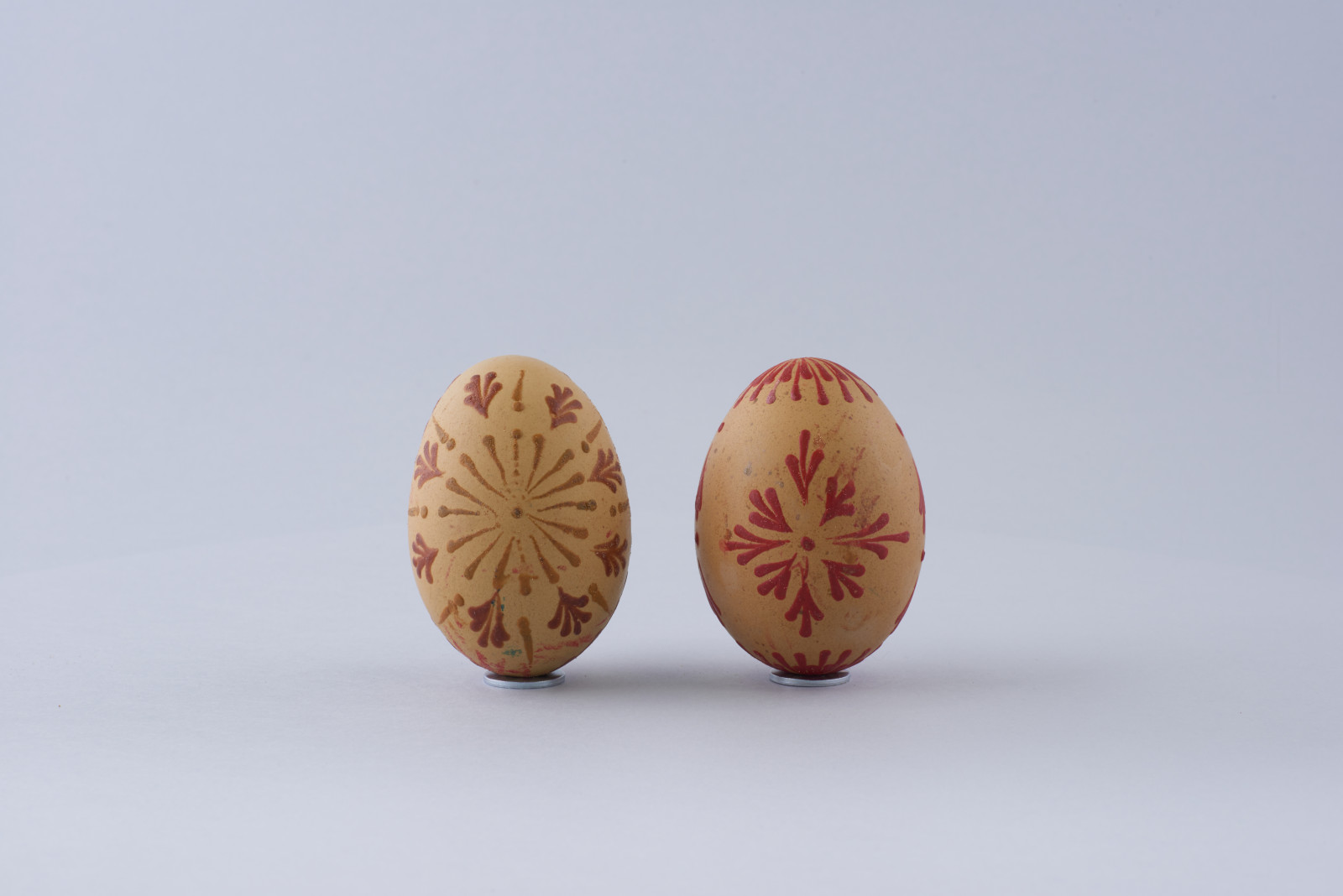 1. Slepačie vajíčko reliéfne voskované špendlíkom, hnedý vosk na prírodnej škrupine, centrálny rastlinný ornament. Poškodené.