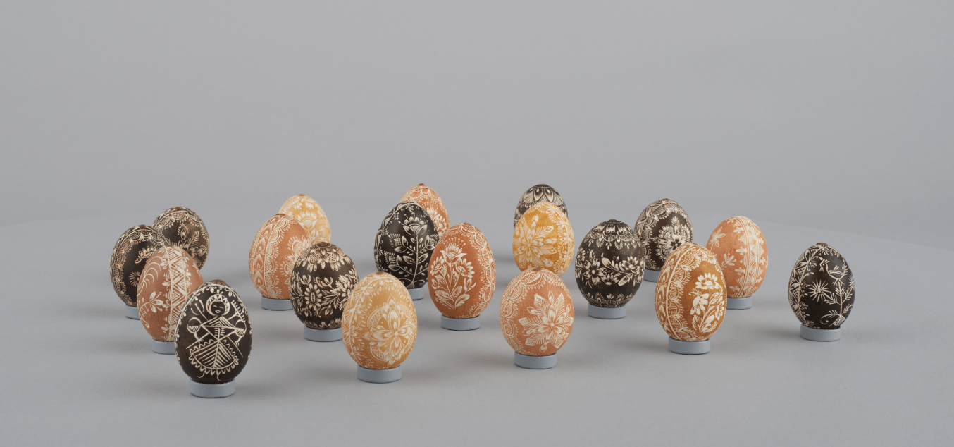 1. Kraslica vyškrabovaná, podkladová farba žltohnedá, ornament rastlinný, plocha je rozdelená vertikálnym geometrickým pásom na dve časti, centrálny motív tulipánu a margarétky.