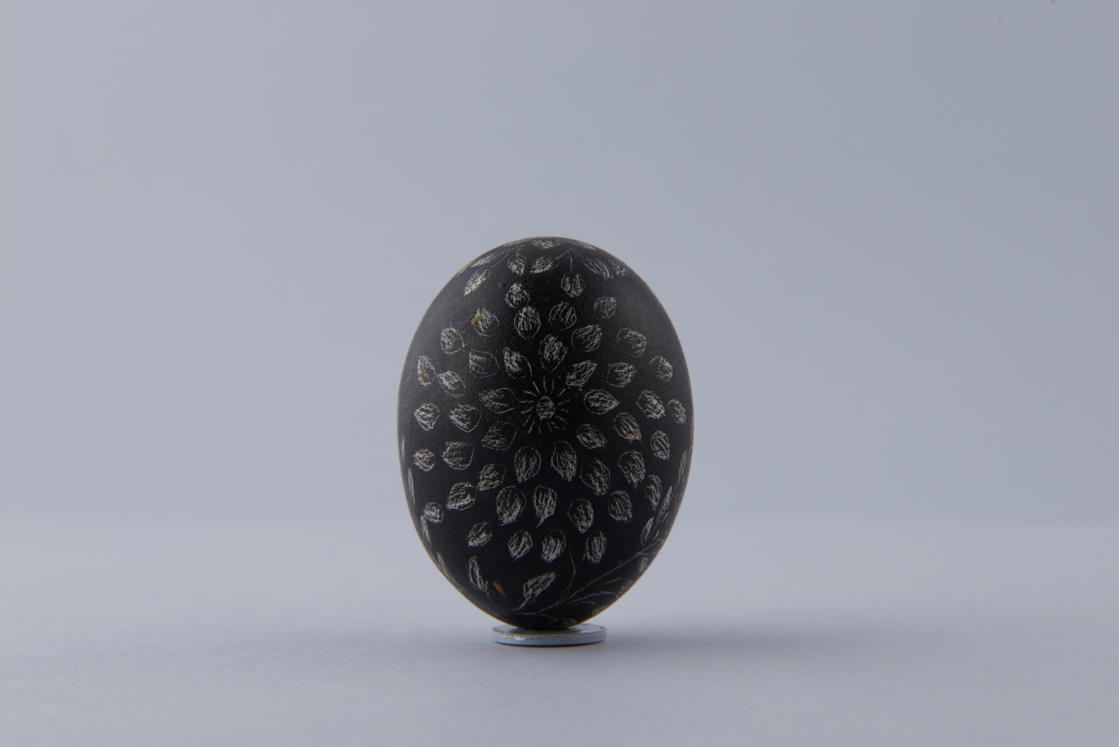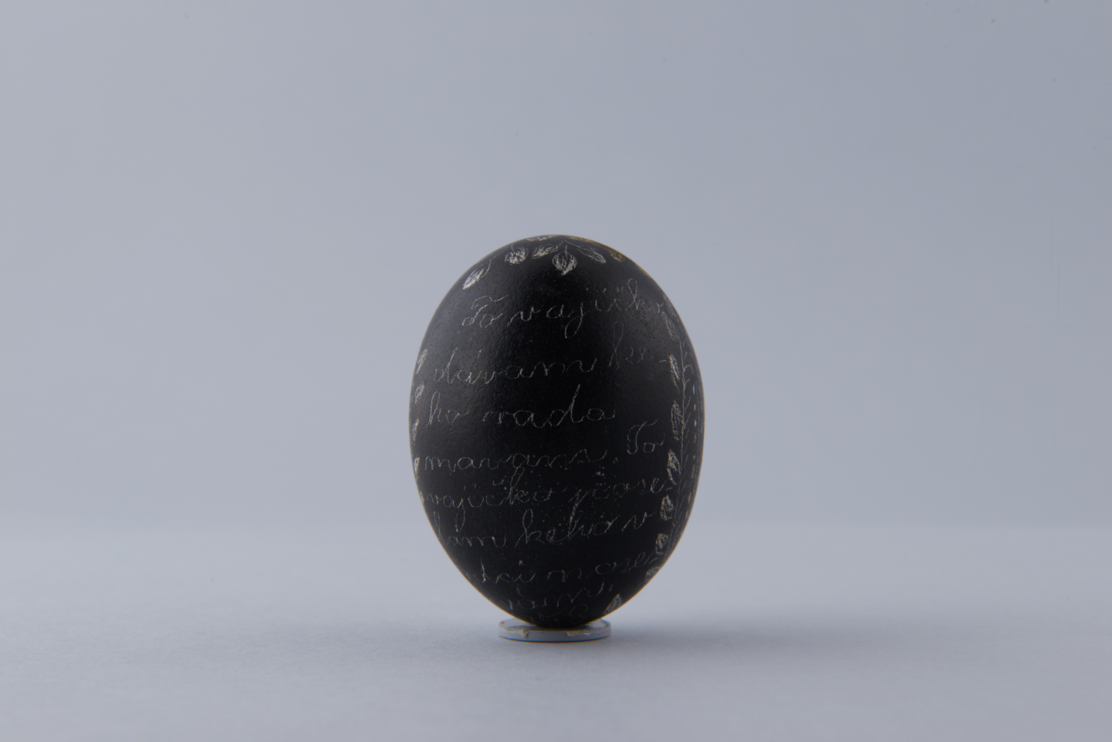 Kraslica vyškrabovaná, farba čierna, ornament biely rastlinný, text v dekore „To vajíčko dávam keho rada mavam. To vajíčko poselam keho v srdci nosevam. 1958 „. Vajíčko je slepačie, plné, surové.