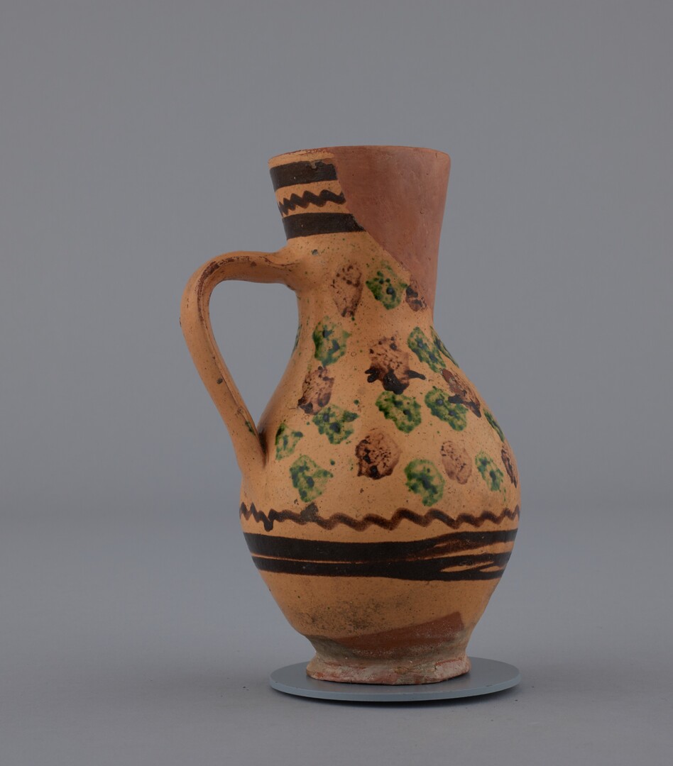 Džbán z červenej hliny, točený na kruhu. Dno úzke, najväčšia výduť v dolnej tretine výšky, hrdlo vysoké, lievikovité, ucho vychádza zo steny hrdla. Dekor: črep obliaty žltou engobou, na bruchu zelené a hnedé fľaky tvorené hubkou. Bezfarebná glazúra.