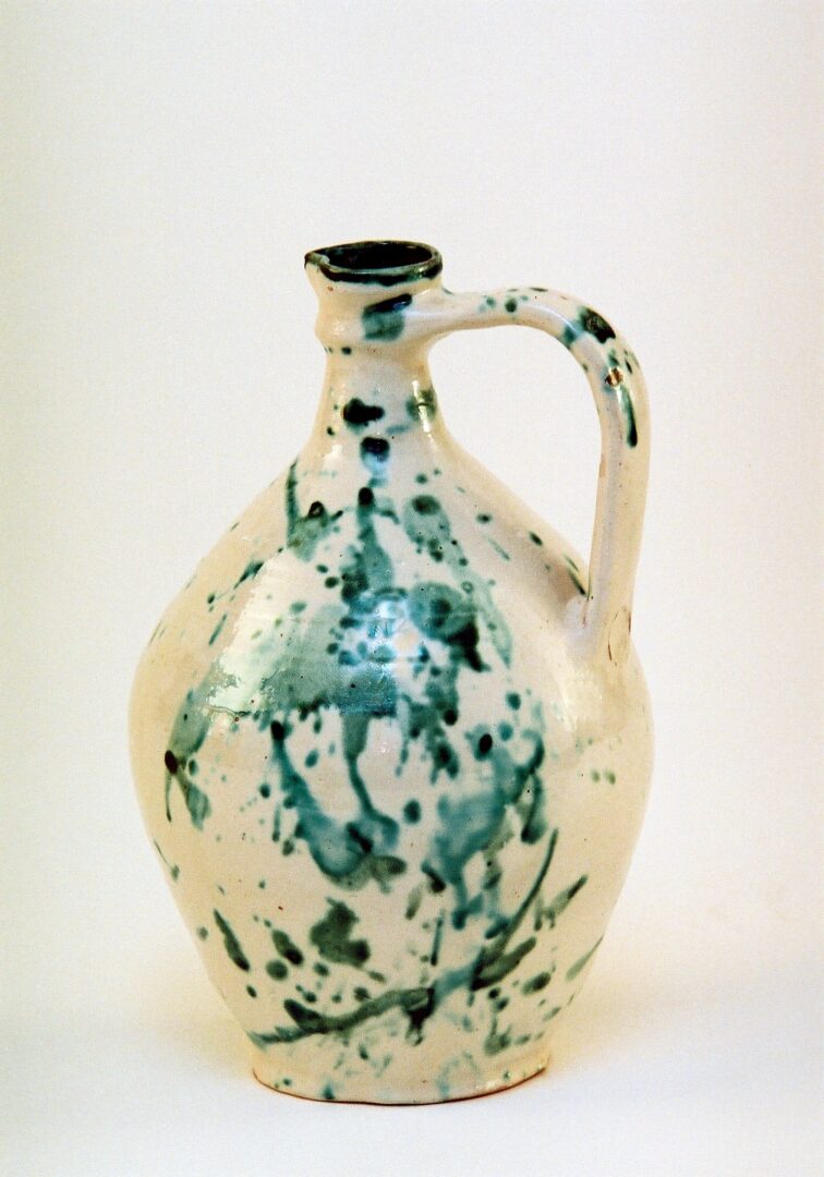 Ručne točený na elektrickom hrnčiarskom kruhu, ucho lepené šlikrom, poliaty bielou hlinkou fŕkaný farebný dekor, transparentná bezfarebná glazúra.