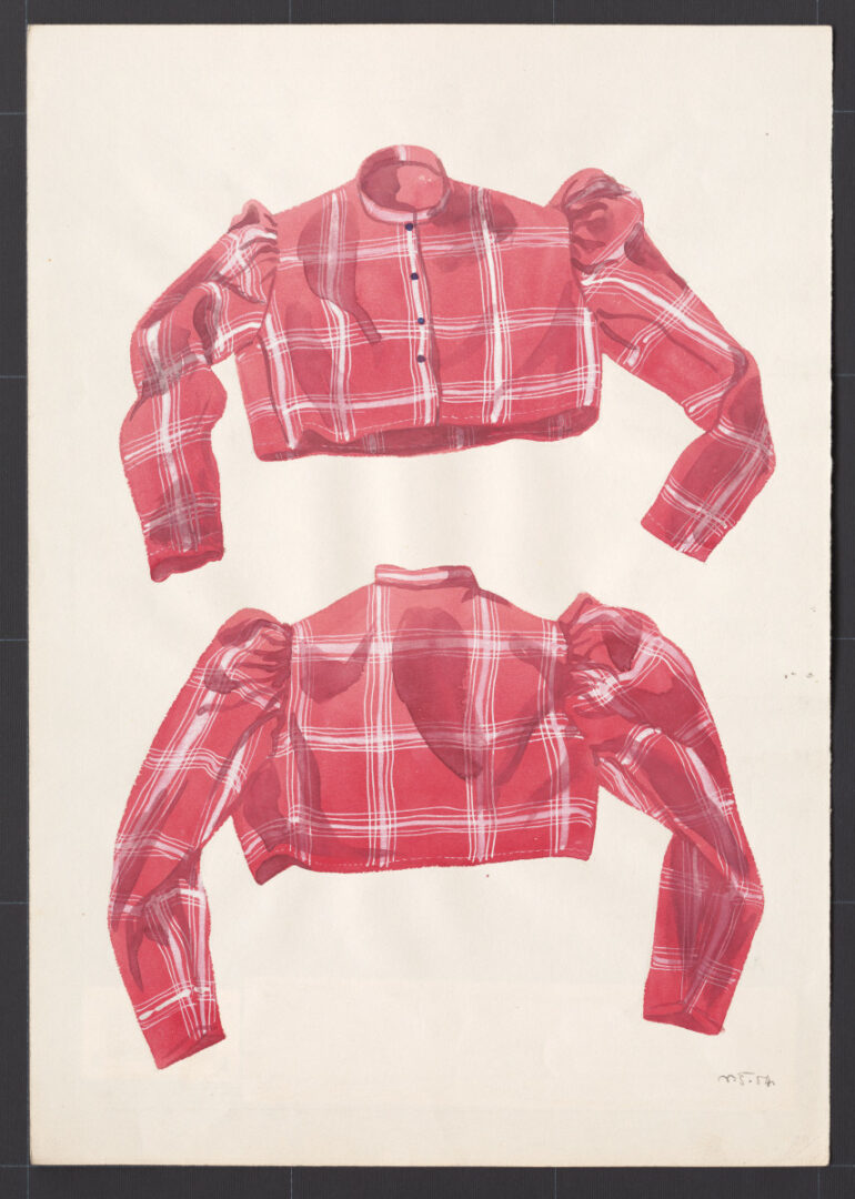 Blúza, Kojšov, prvá polovica 20. storočia. Blúza (jopka) je ušitá z delénu, nie je podšitá a zapína sa na štyri gombičky. Blúzy sa začali nosiť na prelome 19. a 20. storočia. Ženy si ich kupovali v Košiciach. Spočiatku sa blúzy šili z farebného kartúnu, v priebehu prvej polovice 20. storočia sa začali šiť najmä z brokátu s veľkým kvetinovým vzorom.