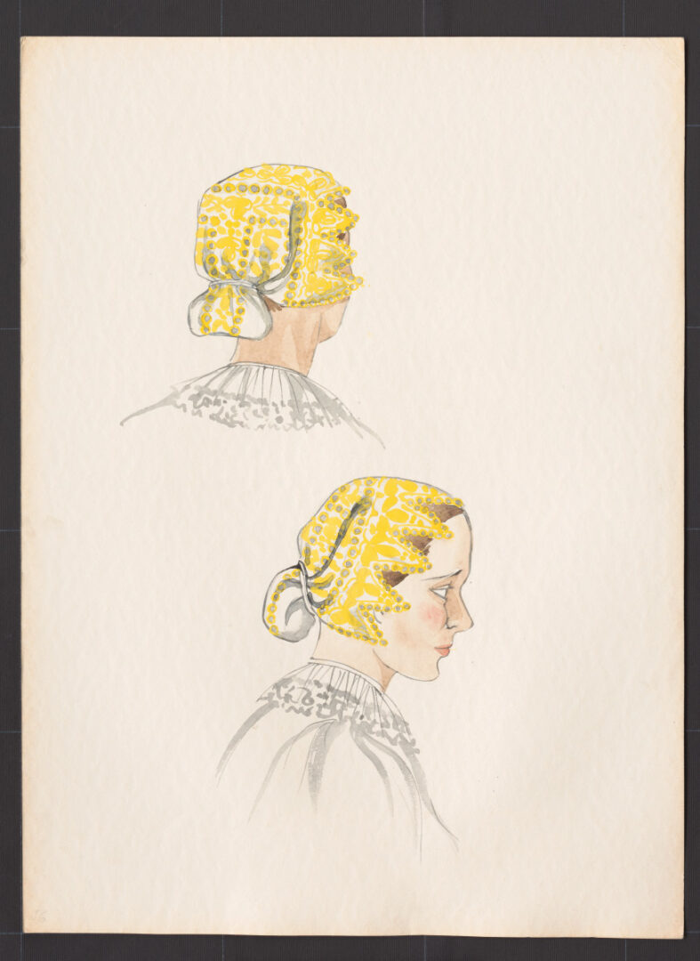 Úprava hlavy vydatej ženy, Piešťany, prvá polovica 20. storočia. Vydaté ženy si na účes s podložkou (grgulou) zakladali plátenné, žlto vyšívané čepce. V staršom období bola na prednom okraji našitá redšia paličkovaná čipka. V strede prvej polovice 20. storočia začali ženy nosiť čepce, ktoré mali na prednom okraji namiesto čipky zuby s dierkovou výšivkou.